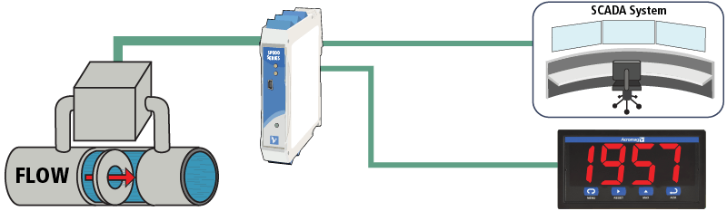 In this application, the PD6000 is displaying flow rate by extracting the square root from the 4-20 mA signal from a differential pressure transmitter. The user selectable low-flow cutoff feature gives a reading of zero when the flow rate drops below a user selectable value. Linear 4-20 mA Analog Output For applications where the input was linearized by the ProVu, the 4-20 mA output will represent that linearized value.